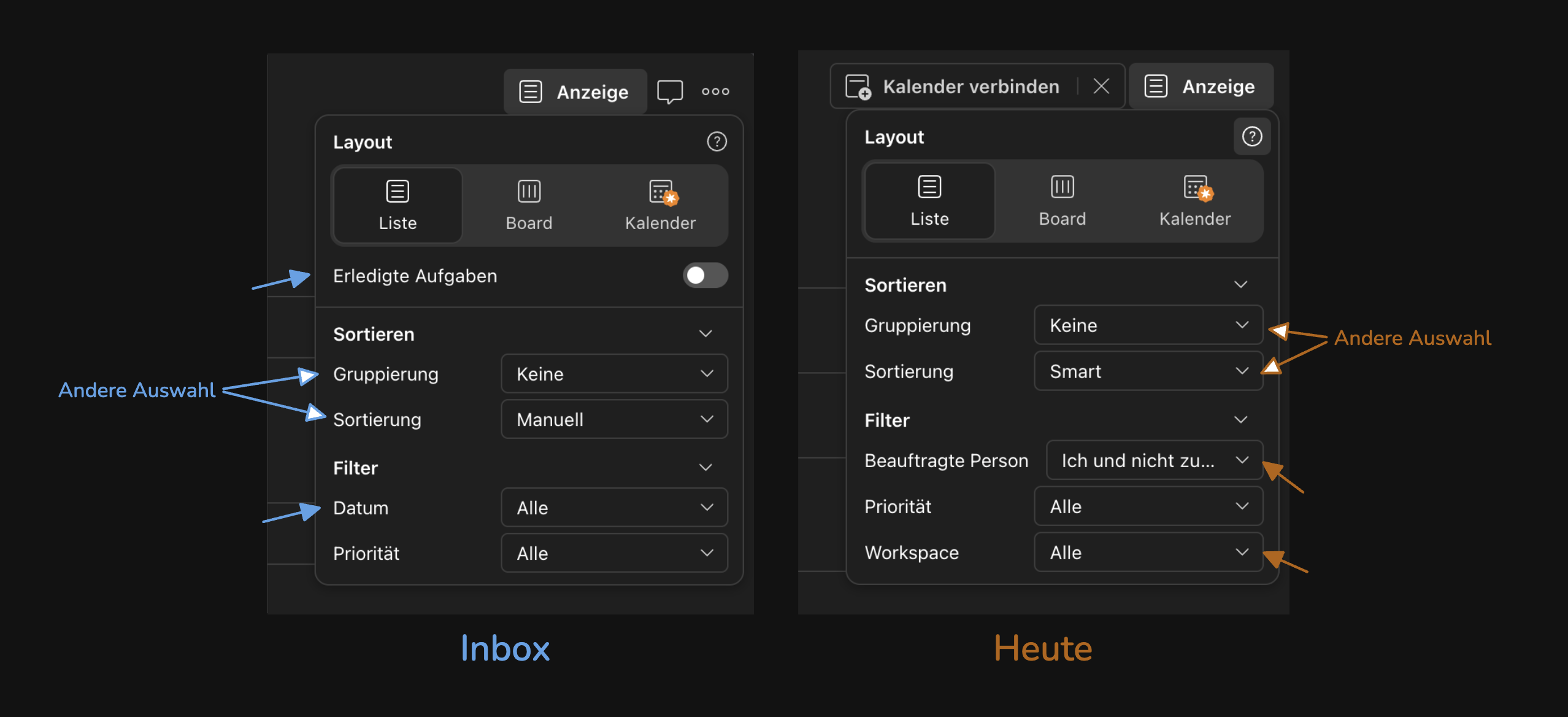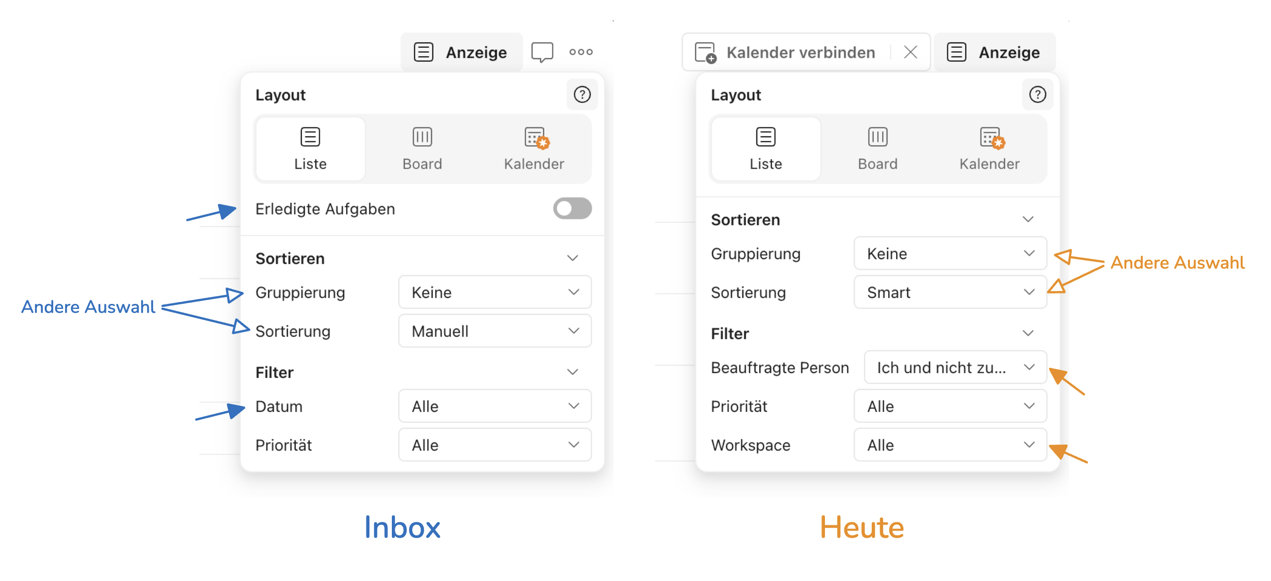 Wer Todoist kennt, kennt auch dieses kleine "Anzeige"-Popup — das, mit dem man Sortierung, Gruppierung, Layout und Filter einstellt. Es sieht überall gleich aus, aber jede Seite hat ihre eigenen Optionen. Der Posteingang erlaubt Gruppierung nach Datum oder Priorität. Die "Heute"-Ansicht bietet zusätzlich Gruppierung nach Projekt. Eine Projektseite ermöglicht manuelles Sortieren per Drag-and-Drop.